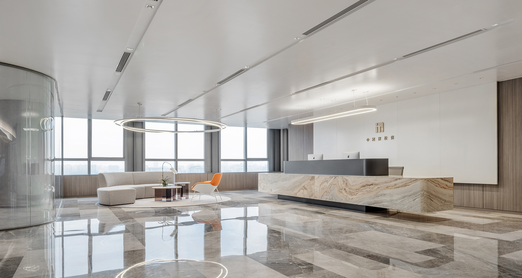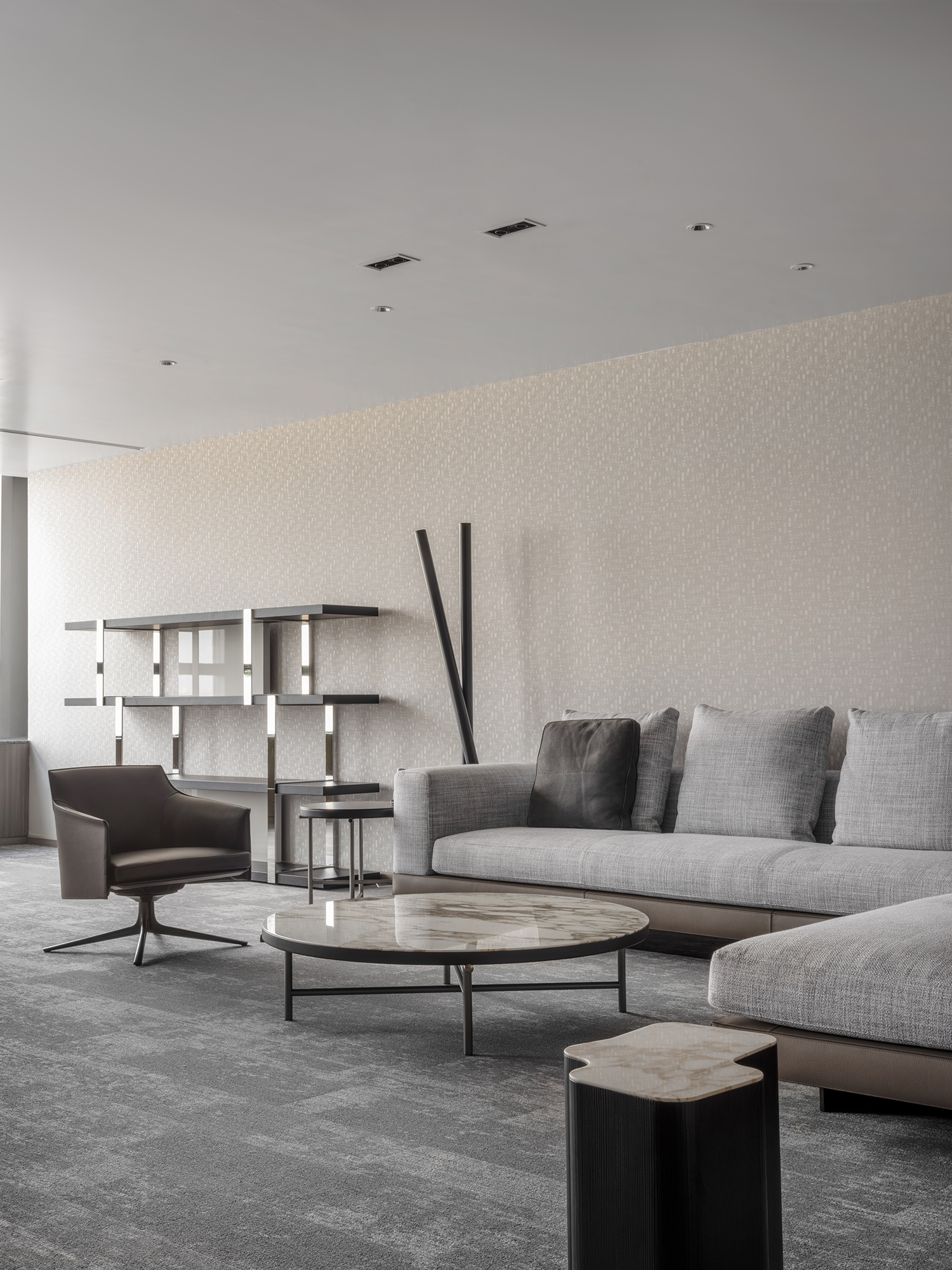 作为一家投资公司,设计上,设计师首先考虑空间的氛围应该是一个安静的环境。他希望,无论外来的访客还是公司的员工,都能感觉到一份“静心”,且愿意长时间停留在空间不同的区域;其次在空间的氛围感上,设计师希望表达一种“优雅”的氛围:踏进公司,犹如进入一家高档酒店,既能感受到高品味,也享有舒适感;最后在色彩搭配上,我们以安静的灰色为主,但有别于单调的,常规的灰色空间,设计师表现的是一种“江南水乡”的灰 - 那种透着一股湿气、润泽的灰,让空间有一种朦胧的层次感,富于意境的柔和之美。