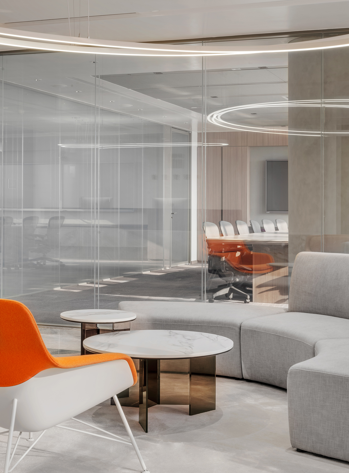 其次解决的难点有:电梯次入口正对着的方向,即东面三角形状的玻璃幕墙。如何化解空间中的冲突并有效利用它?设计上想到用“圆”的形体,将其置于二者之间。设计师将这个圆形空间设计成封闭的冥想室,这样不仅消弱了三角形的斜面、又让电梯厅次入口有了遮挡,有效地缓和了空间中的不规则,同时让空间多了一些变化。